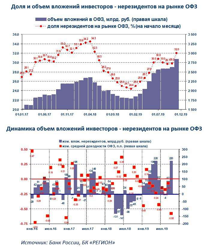 По данным Банка России, доля нерезидентов на рынке ОФЗ по состоянию на 1 ноября 2019 года составляла 32,0%, что на 2,2% выше показателя предыдущего месяца. Номинальный объем гособлигаций, принадлежащих нерезидентам, на 1 ноября составлял 2,837 трлн рублей при общем объеме рынка ОФЗ 8,860 трлн. рублей. Таким образом, в номинальном выражении прирост вложений нерезидентов составил 220 млрд руб., повторив тем самым абсолютный рекорд за всю историю рынка, который был зафиксирован в мае т.г.