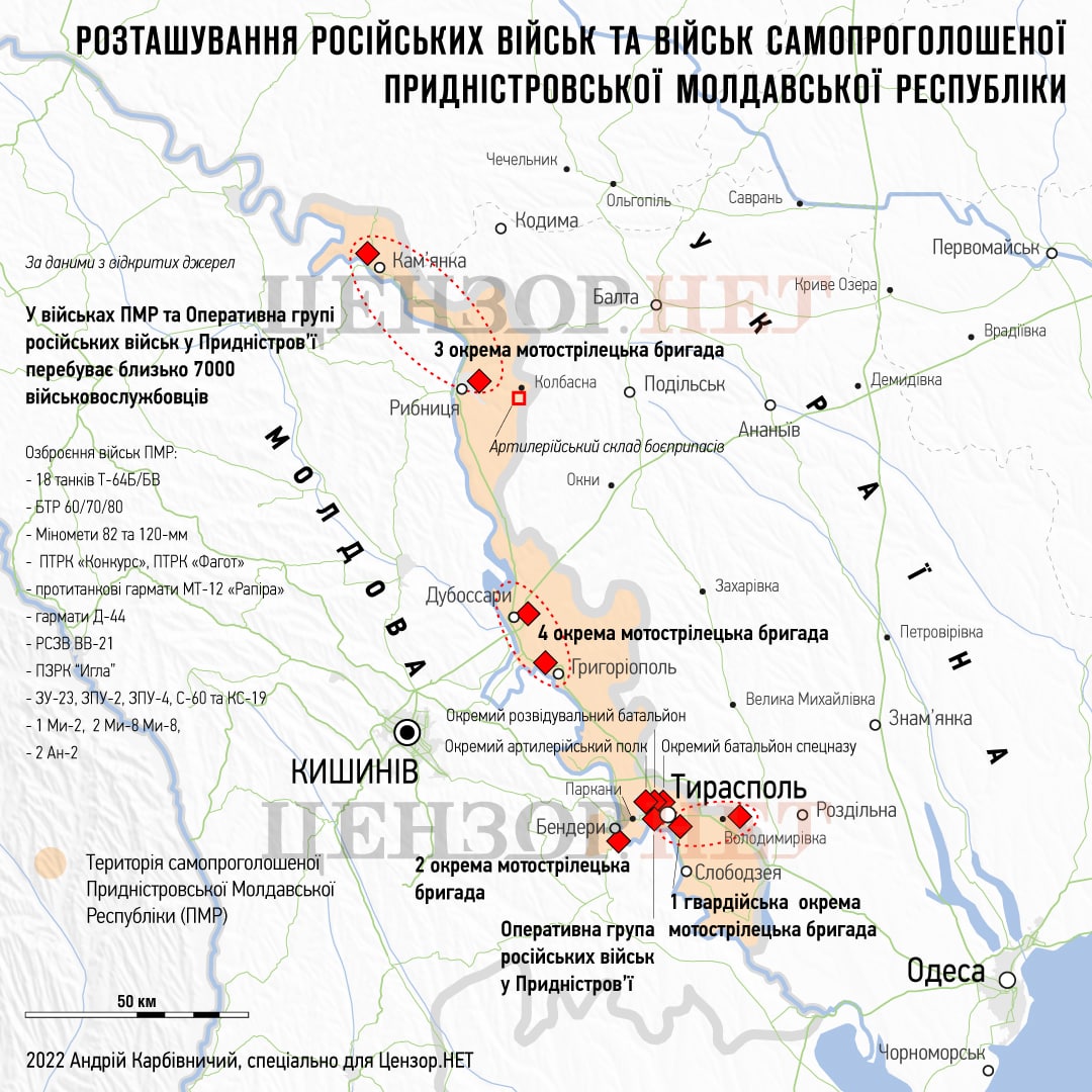 "Підрозділи, оперативної групи російських військ продовжують перебувати у повній бойовій готовності. Збройні формування Придністровського регіону Республіки Молдова несуть службу у посиленому режимі. Проводиться підготовка до евакуації родин офіцерів оперативної групи російських військ", - зазначили в Генштабі.