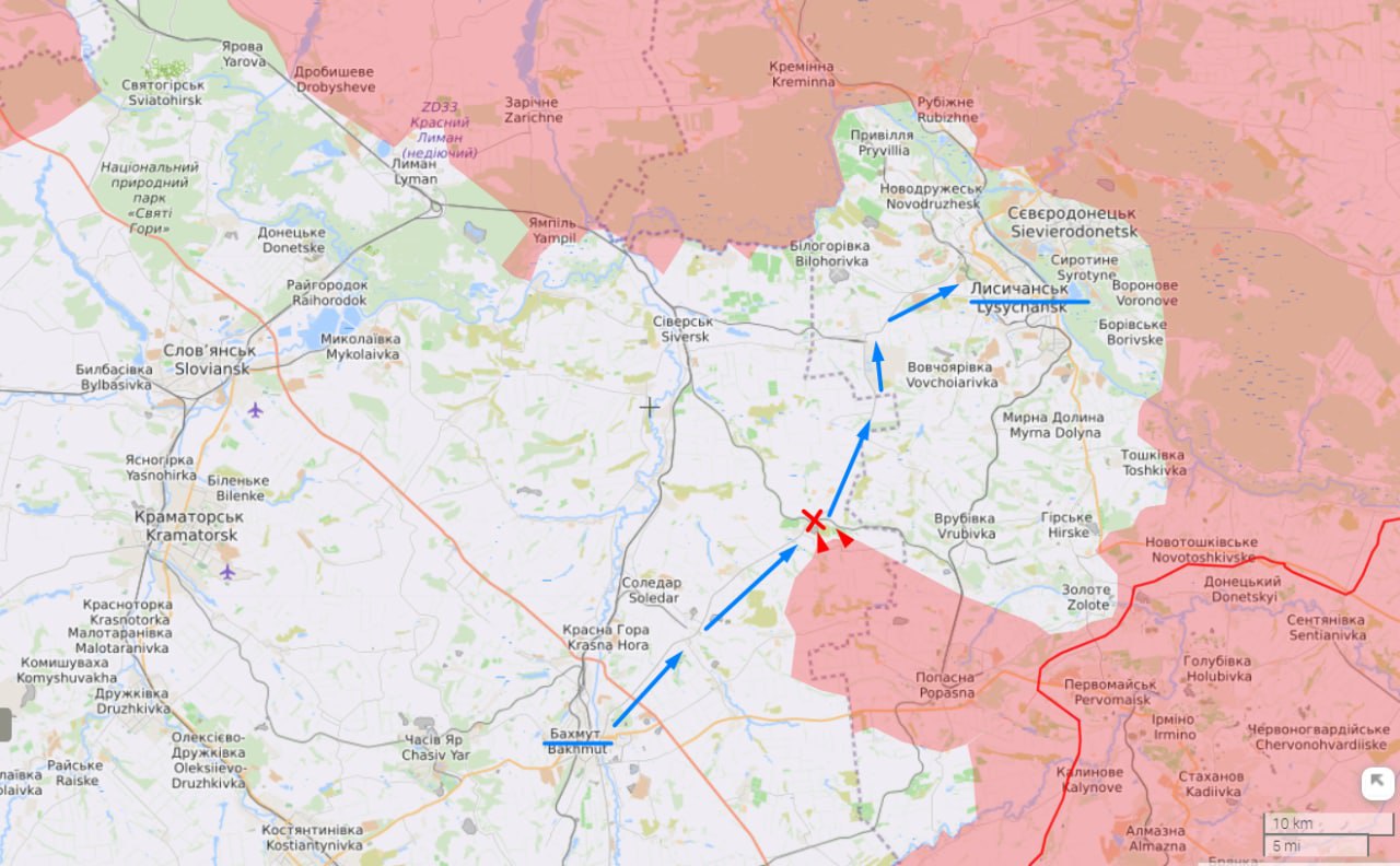 Другий день у цьому районі йдуть бої. Всього сім діб ворог намагається прорвати нашу оборону та перехопити трасу. Противник прагне закріпитись та розширити зону прориву. Якщо противник зможе закріпитись, це буде означати оперативне оточення наших військ у районах Сєвєродонецька та Лисичанська.