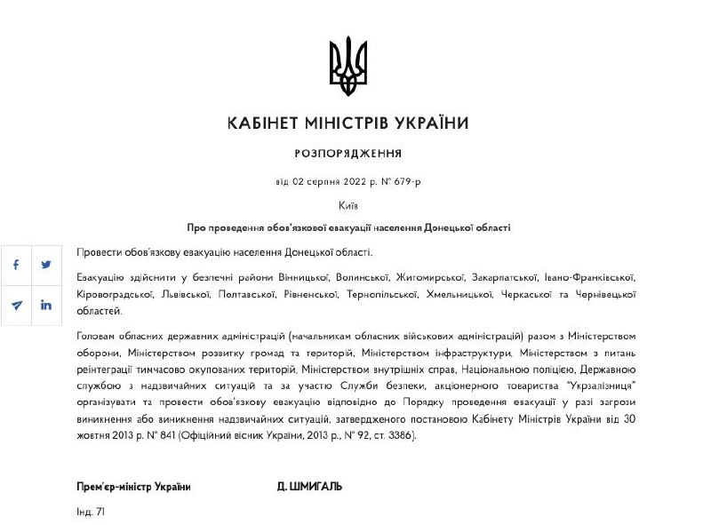 ‼️Прем'єр-міністр Денис Шмигаль підписав розпорядження щодо обов'язкової евакуації населення Донецької області