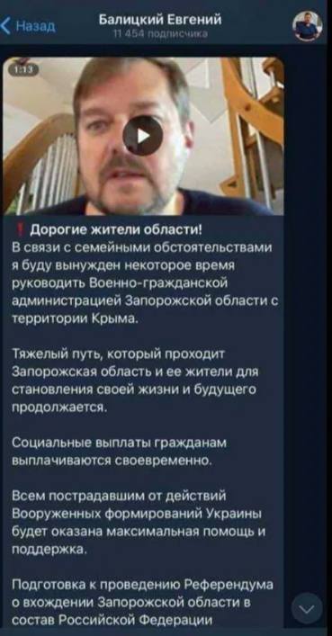 Гауляйтер Запоріжжя повідомив у своєму Telegram-каналі, що за "сімейними обставинами" відтепер здійснюватиме "керівництво областю" з території тимчасово окупованого Криму. Проте потім видалив свій пост.