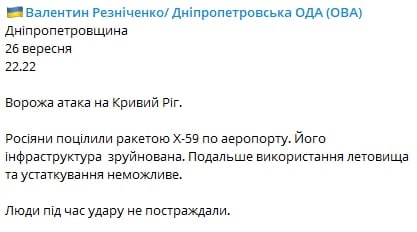 "Росіяни поцілили ракетою Х-59 по аеропорту. Його інфраструктура зруйнована. Подальше використання летовища та устаткування неможливе", - повідомив у голова Дніпропетровської ОВА Валентин Резніченко.