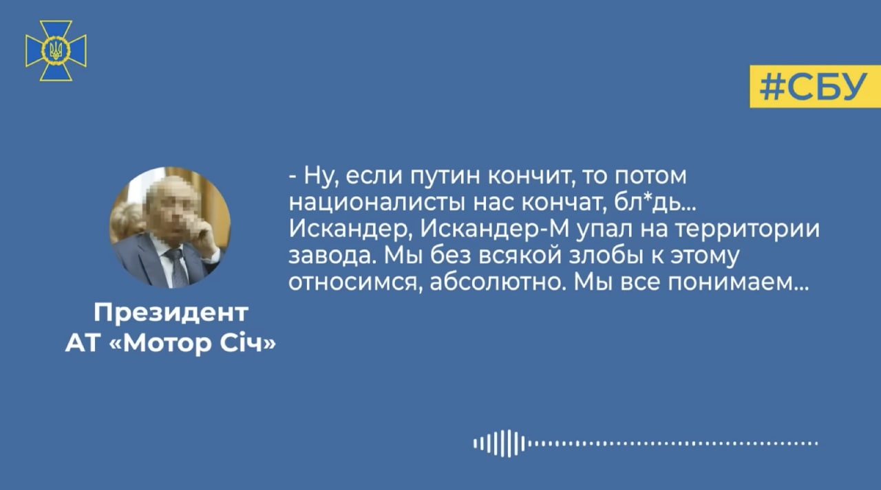 За даними джерел Цензор.НЕТ, Служба безпеки як мінімум з 2019-го року прослуховувала директора АТ Мотор січ В’ячеслава Богуслаєва, і мала докази його незаконних стосунків з РФ та постачання двигунів для російських бойових гвинтокрилів, що прямо заборонено українським законом.