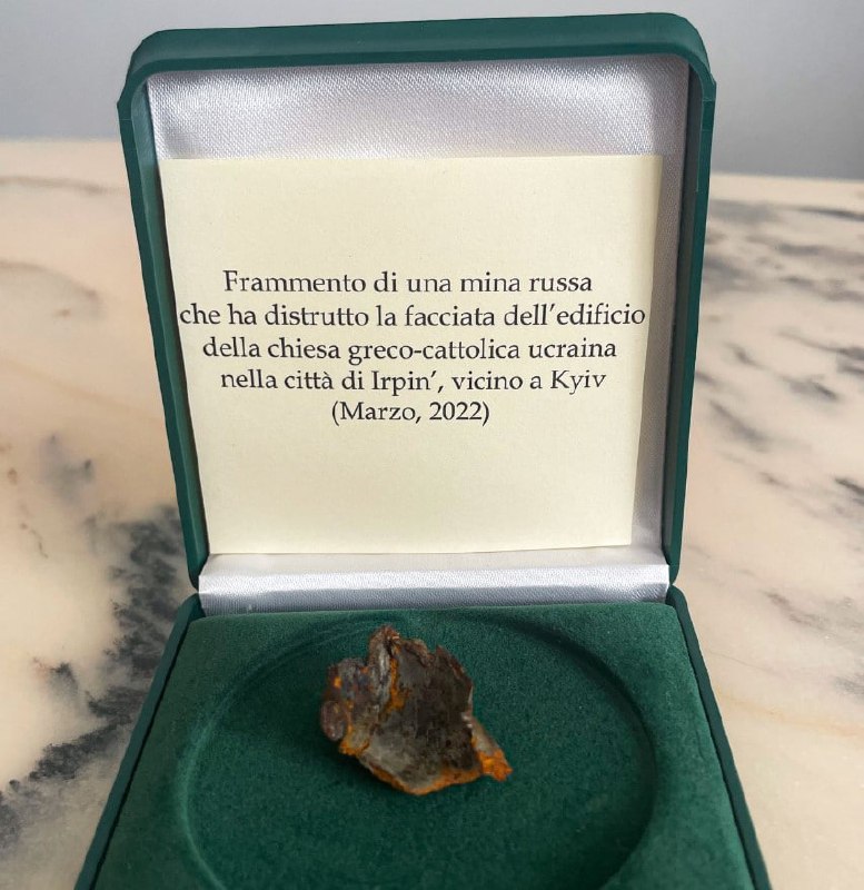 На завершення аудієнції Блаженніший Святослав подарував Святішому Отцеві символічний подарунок — фрагмент російської міни, яка у березні знищила фасад храму УГКЦ в Ірпені.