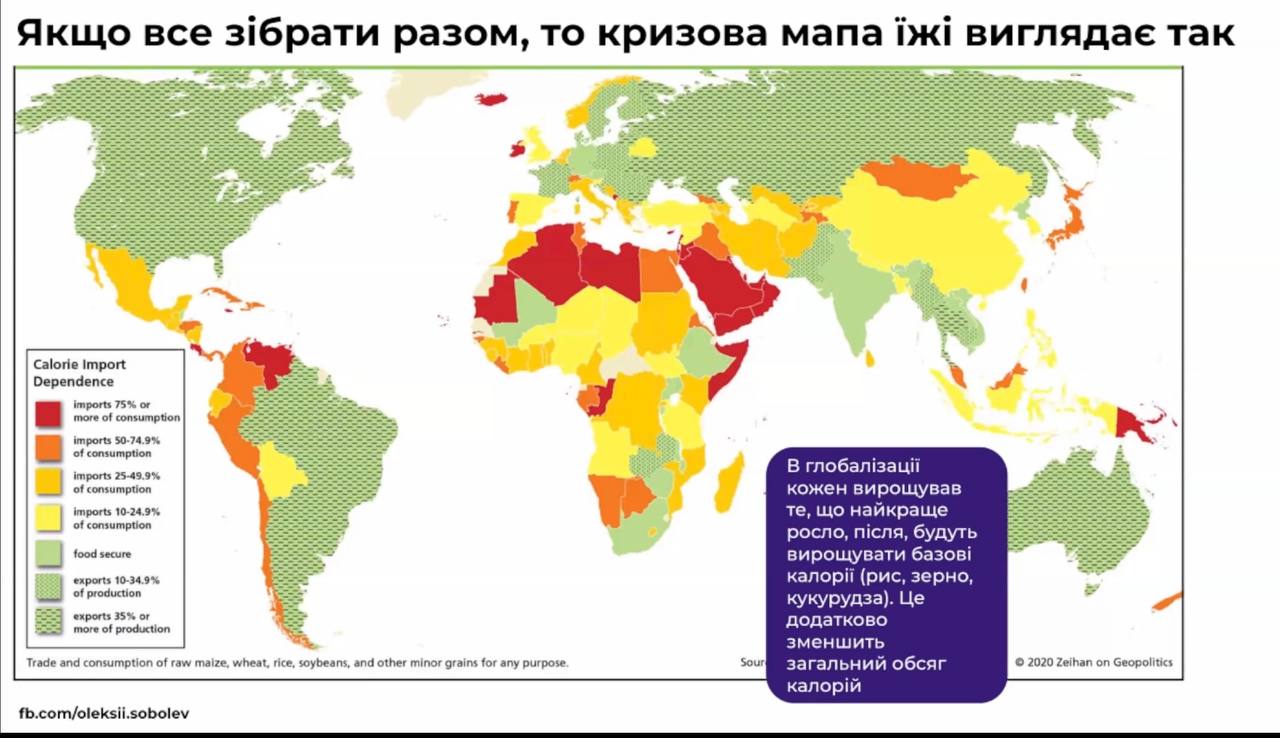 На карті внизу червоним позначені країни, які імпортують більше 75% їжі; помаранчевим та жовтим - 25-75% (слайд взято у Ярослав Железняк)