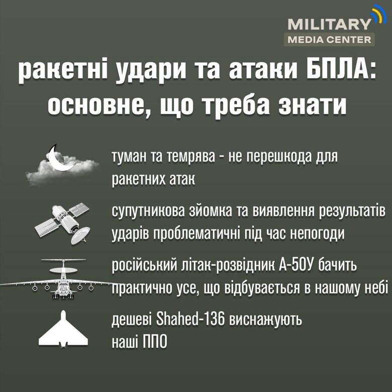 Спокійна погода і ясне небо допомагають провести розвідку об’єктів удару. Але ні туман, ні мряка суттєво не впливають на плани росіян щодо атак.