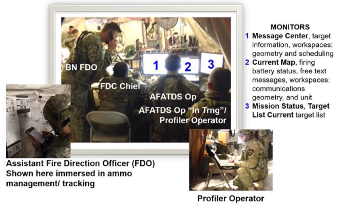 Вигляд батальйонного командного пункту управління артилерією армії США. Для зручності управління тут три монітори, але оператору може вистачити і одного ноутбука системи AFADTS-IFADTS.