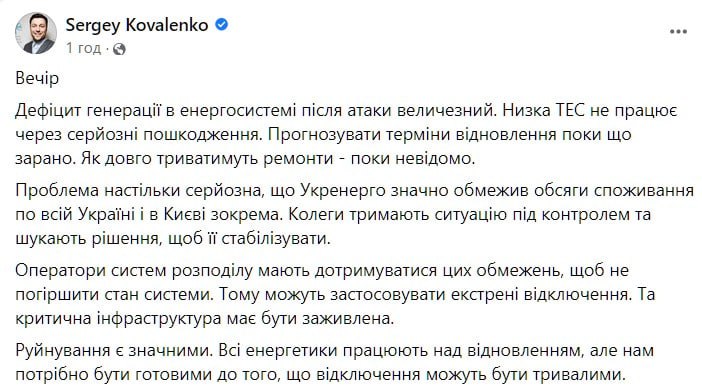 "Такі атаки, як була в Києві, не є новиною для України. В Києві вона була вперше, але маємо такі приклади як Харків, Дніпро, Миколаїв, Запорізька область. Де застосовує ворог довгий час ракети С-300 для завдання ударів по об'єктах критичної інфраструктури, які він намагається знищити.