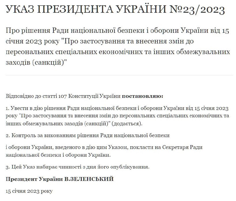 "Увести в дію рішення Ради національної безпеки і оборони України від 15 січня 2023 року "Про застосування та внесення змін до персональних спеціальних економічних та інших обмежувальних заходів (санкцій)", - йдеться в тексті указу.