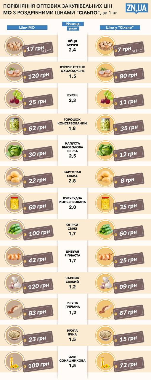 Згідно з документами, Міністерство оборони законтрактували яйця по 17 грн за штуку, тоді як роздрібна ціна в магазині Києва зараз близько 7 грн за штуку. Картоплю замовили по 22 грн за кілограм, при цьому роздрібна ціна в магазині становить 8–9 грн.