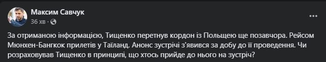 "За отриманою інформацією, Тищенко перетнув кордон із Польщею ще позавчора. Рейсом Мюнхен-Бангкок прилетів у Таїланд. Анонс зустрічі з'явився за добу до її проведення. Чи розраховував Тищенко в принципі, що хтось прийде до нього на зустріч?", - написав він.