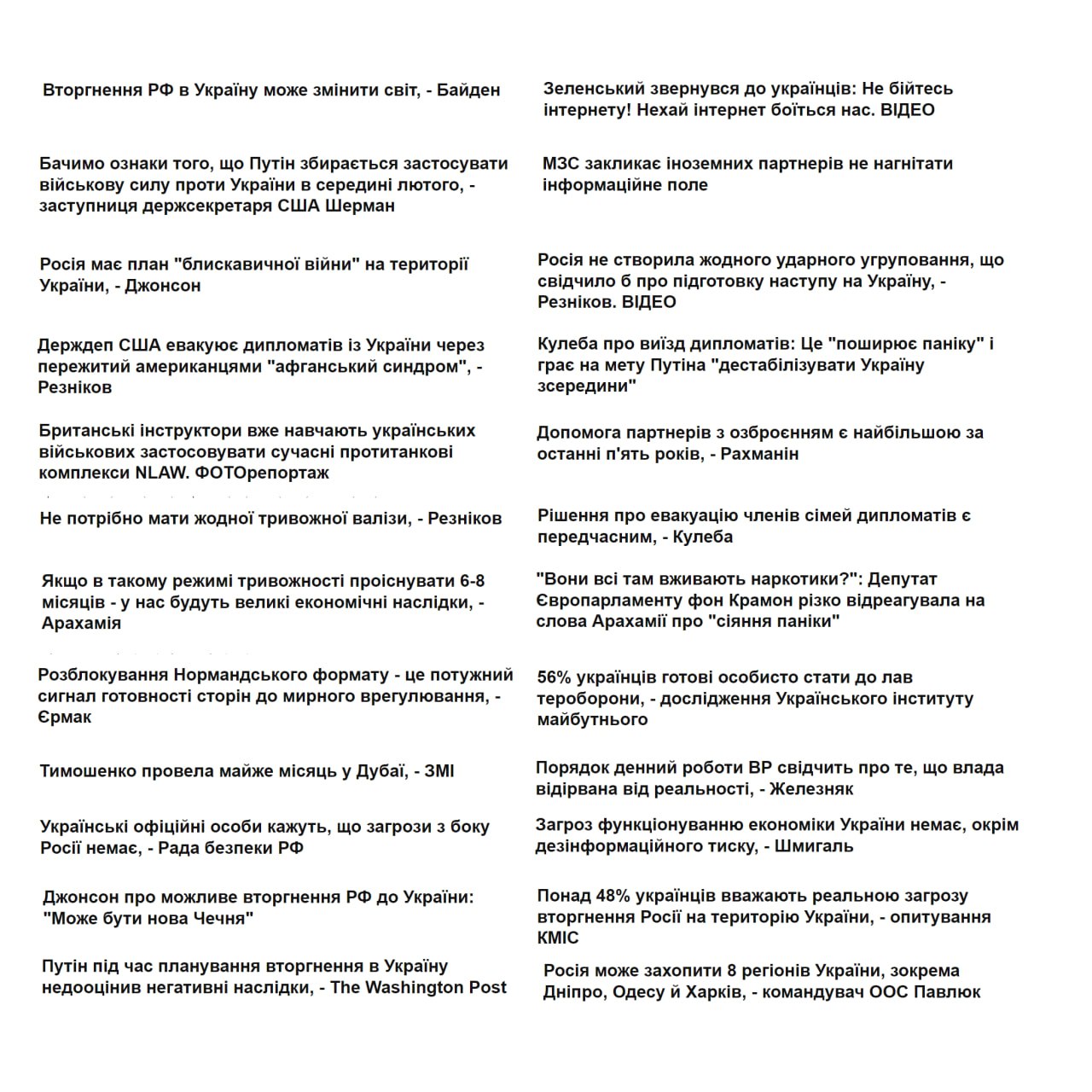 Допис для того, щоб дати відповіді самим-собі. Цікаво почути наших читачів. Подивились заголовки від 24 по 30 січня (на зображенні, це лише одна сота від новин того тижня, ви теж можете глянути архів). Західні країни вже починали евакуацію посольств та постачання зброї - ПТРК та ПЗРК, а міжнародні ЗМІ друкували різноманітні карти. Українська влада звинувачувала партнерів у нагнітанні інформаційного поля, нагадуючи, що у 2021 році Росія вже збирала на кордонах з Україною велику чисельність військ. Ніби й достатньо інформації, але ж ми продовжували жити без поправки на "велику війну".