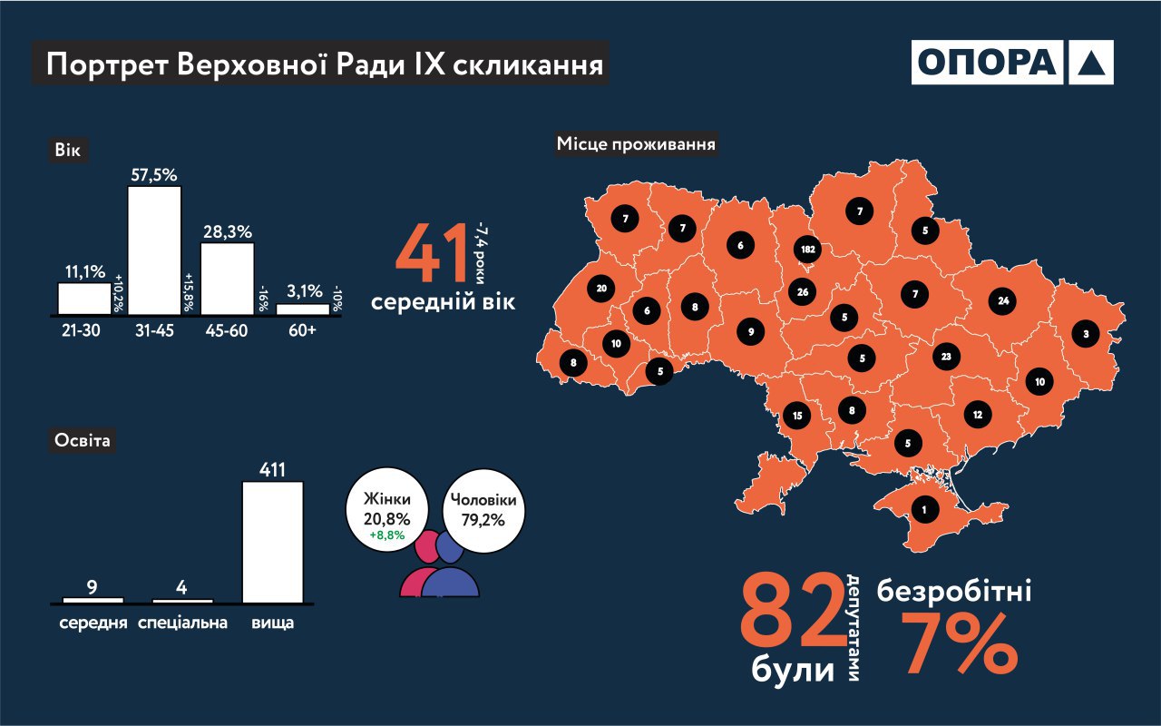 Громадянська мережа "Опора" порахувала, що Верховна Рада 9-го скликання оновиться на 80,4%. Склад парламенту помолодшає в середньому на 7,4 років, адже новообраних майбутніх нардепів віком 21-45 років збільшилось загалом на 26%. До Верховної Ради обрано 336 чоловіків (79,8%) та 88 жінок (20,8%). 411 депутатів мають вищу освіту, 9 – середню спеціальну. Ще четверо із середньою загальною освітою. 30 осіб на момент обрання були безробітними. Найбільше новообраних народних депутатів проживають у Києві (182 особи).
