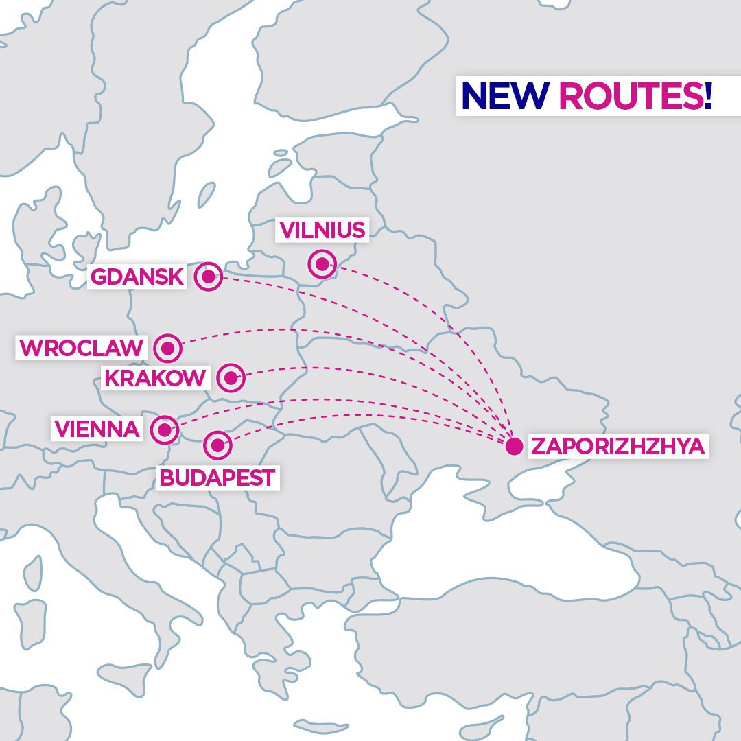 Пряме авіасполучення з’єднає Запоріжжя з Будапештом, Віднем, Вільнюсом, Вроцлавом, Гданськом та Краковом. Кожен із рейсів курсуватиме двічі на тиждень. Заявлена вартість квитків стартує від 14,99 євро. Польоти в Запоріжжі Wizz Air почне з 29 березня 2020 року.