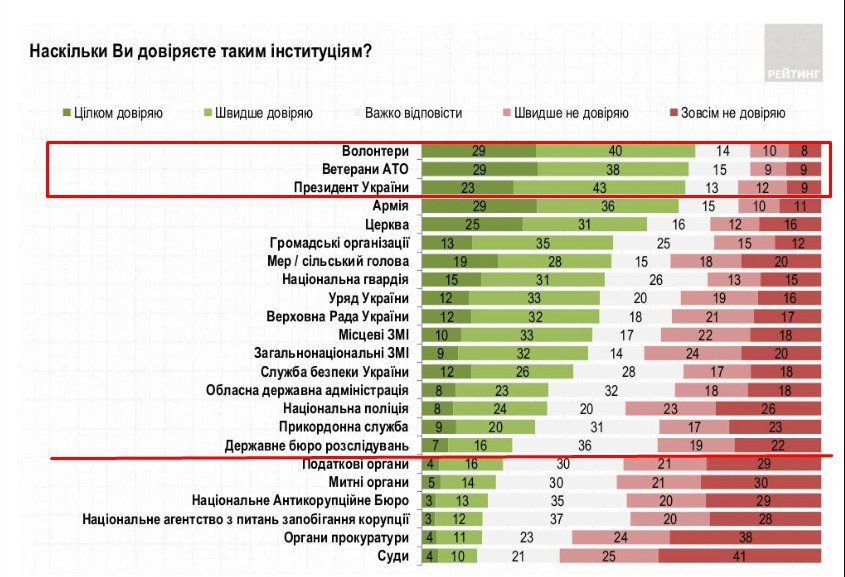 Також високий рівень довіри до армії (65%) і до церкви (56%). Громадським організаціям довіряють 48% респондентів, міським / сільським головам - 47%, Національній гвардії - 46%, Кабінету міністрів - 45%, Верховній Раді - 44%, місцевим ЗМІ - 43%, загальнонаціональним ЗМІ - 42%.