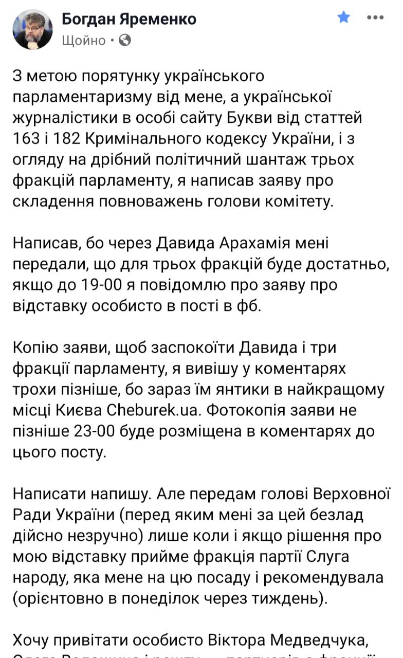⚡️ Яременко написав заяву про складення повноважень голови комітету