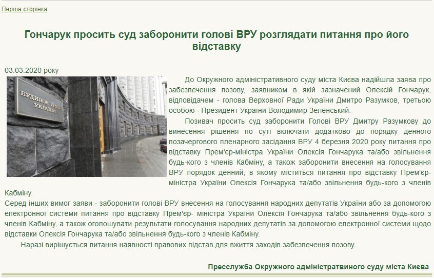 "Інформація про начебто подану заяву до Окружного адміністративного суду міста Києва прем'єр-міністром Олексієм Гончаруком не відповідає дійсності. Вся інформація про діяльність прем'єр-міністра України публікується на офіційних ресурсах уряду і сторінках глави уряду в соціальних мережах", - сказано в повідомленні.