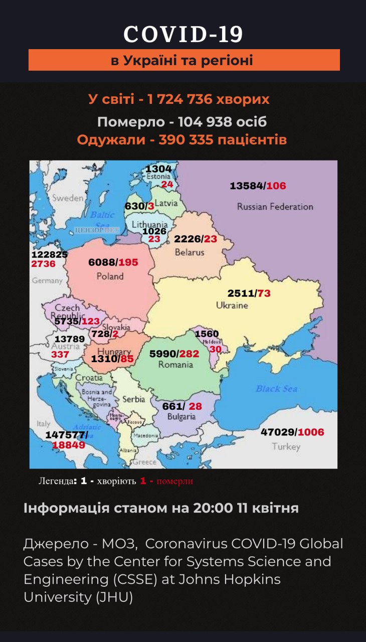 Зазначимо, що станом на 11 квітня у світі хворіє 1 704 565, померло 103 257 осіб, одужали 378 838.