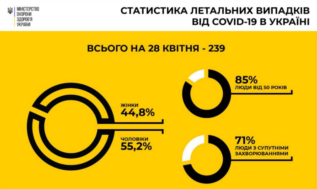 З початку епідемії COVID-19 в Україні зафіксовано 239 летальних випадків у осіб, які хворіли на коронавірусну інфекцію.