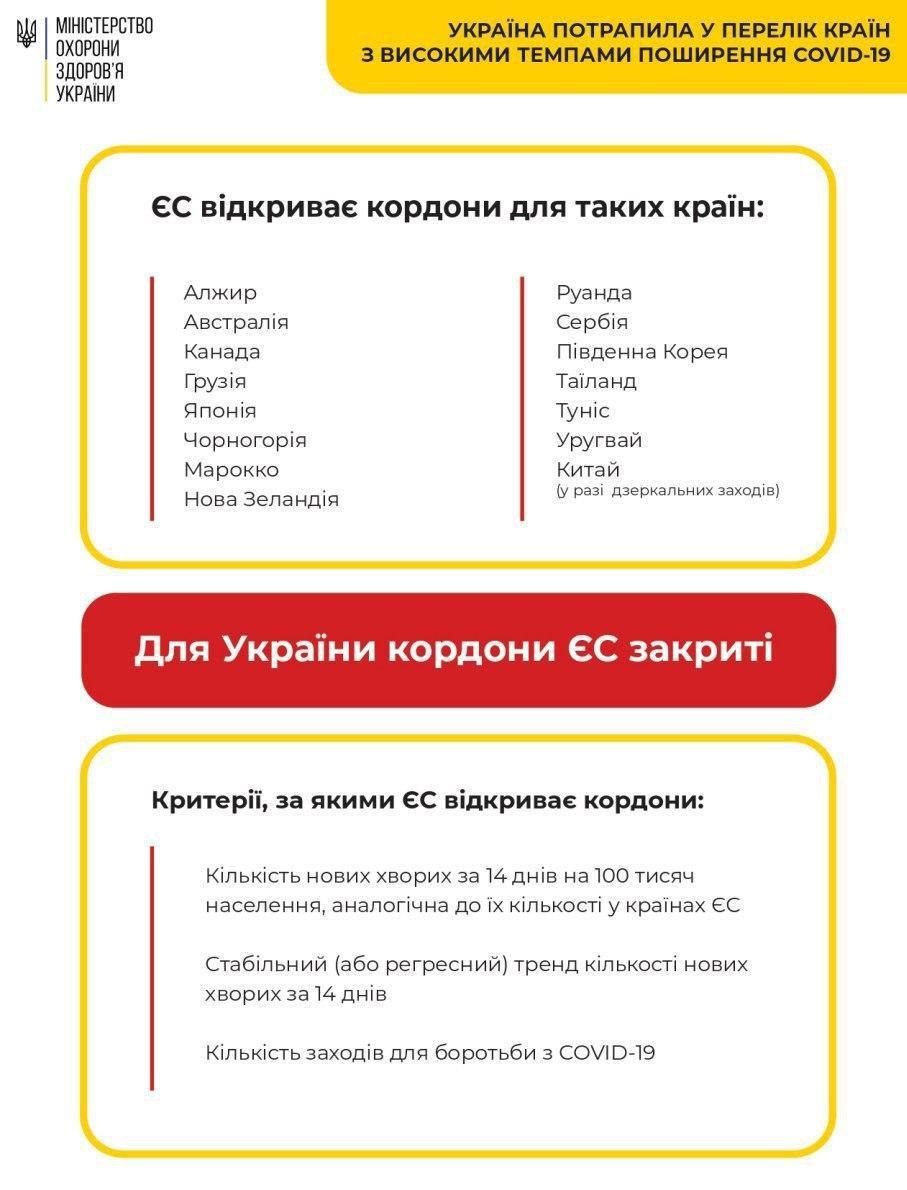 Рада ЄС опублікувала список критеріїв, за якими від сьогодні починається відкриття кордонів. До списку ввійшли 14 країн, які відповідають всім епідеміологічним критеріям Євросоюзу - Україна не ввійшла до списку.