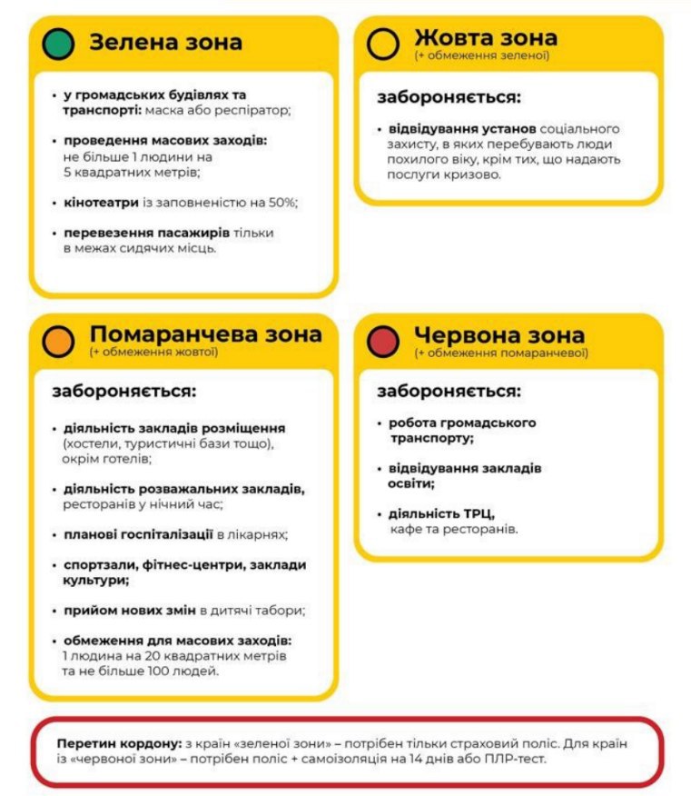 "З 1 серпня починає діяти нова постанова уряду. Ця постанова регламентуватиме питання карантину на території країни. У нас буде поділ на чотири зони: зелену, жовту, помаранчеву і червону", - розповів міністр охорони здоров'я Максим Степанов.