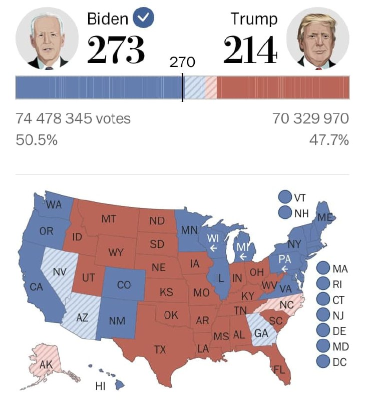 Демократ Джозеф Байден переміг республіканця і чинного президент США Дональда Трампа у ключовій для перемоги на виборах президента Пенсильванії. Для перемоги необхідно було 270 голосів виборців.
