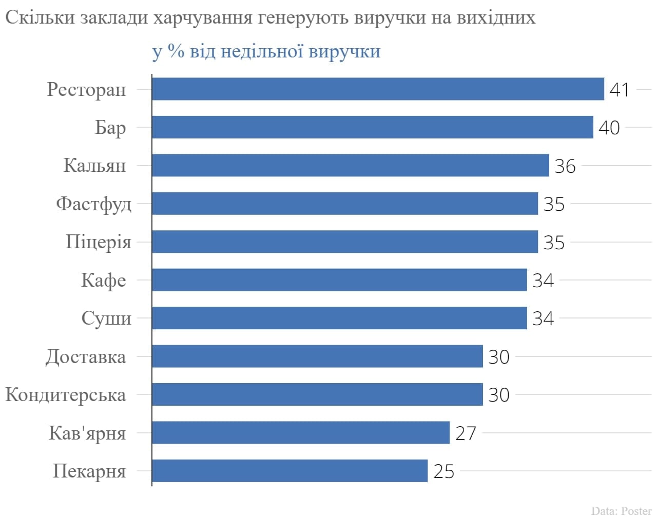 💸 За даними компанії Poster на вихідних ресторани заробляють в середньому 41% від свого тижневого обороту, бари - 40%, піцерії і кальянні - 35%, фастфуд - 31%, кондитерські - 30%. Точніше заробляли. Чи виживуть ці бізнеси - невідомо. Власники кінотеатрів (заробіток на вихідних - 80%) вже кажуть, що будуть змушені закриватися.