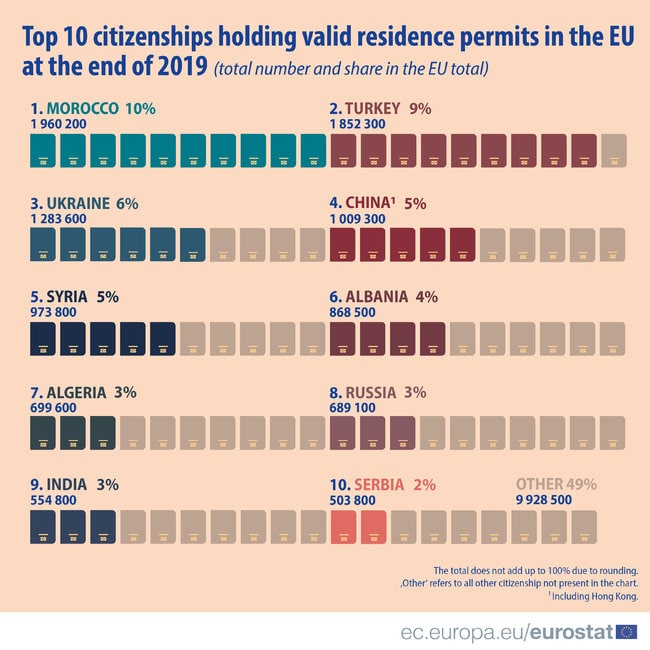 Так, станом на кінець 2019 року, всього було 20,3 мільйона чинних посвідок на проживання, що дозволяють громадянам країн, що не входять в ЄС, проживати в Євросоюзі.