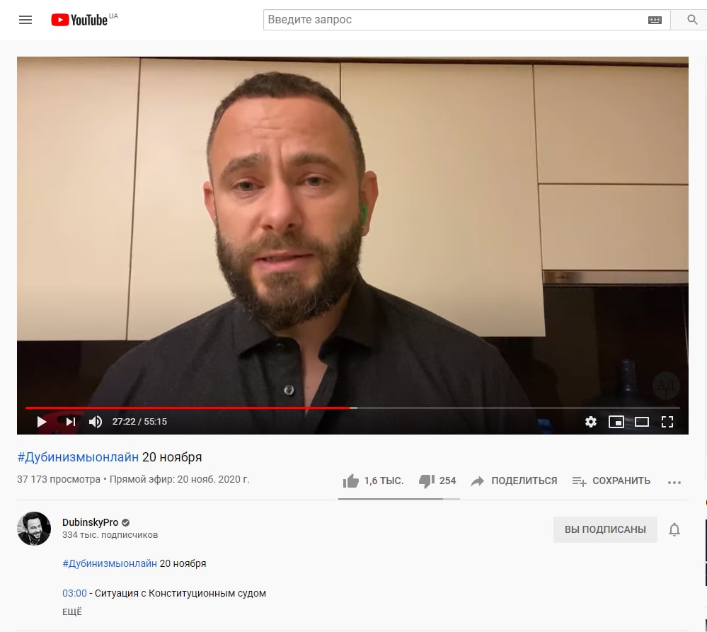 🔸 Сьогодні ж, 28 січня, YouTube заблокував канал Дубінського. На цей момент на сторінці з'являється повідомлення: "Акаунт заблоковано за порушення правил спільноти YouTube".