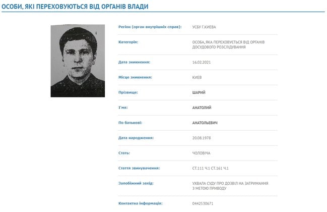 Шарій перебуває у списку "осіб, які переховуються від органів влади" із 16 лютого 2021 року. Місцем зникнення пропагандиста правоохоронці зазначили Київ.