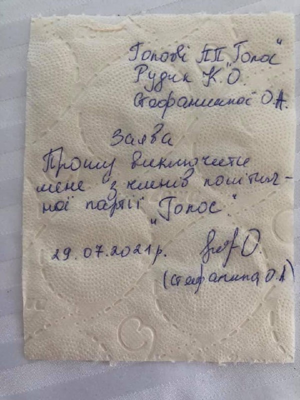 Ольга Стефанішина також повідомила про вихід з партії "Голос" та написала заяву на туалетному папері.