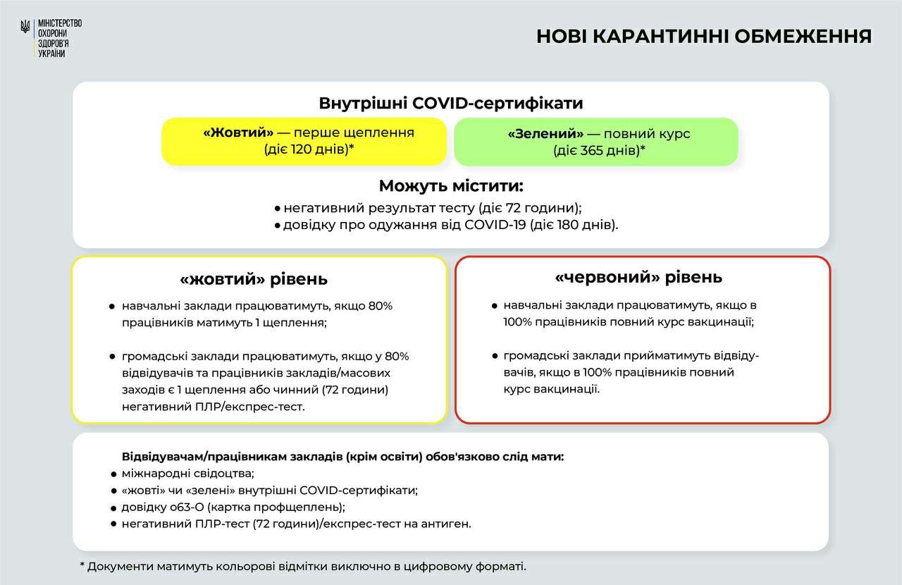 "Обмеження "жовтої" та "червоної" зон не поширюватимуться на ті заклади, де персонал та відвідувачі вакциновані, мають негативний тест або підтвердження нещодавно перенесеної хвороби. Це той метод, який на сьогодні успішно використовує низка європейських і світових країн для того, щоб уберегти людей і водночас не зупиняти економічну активність країни", — зазначив прем’єр-міністр Денис Шмигаль.
