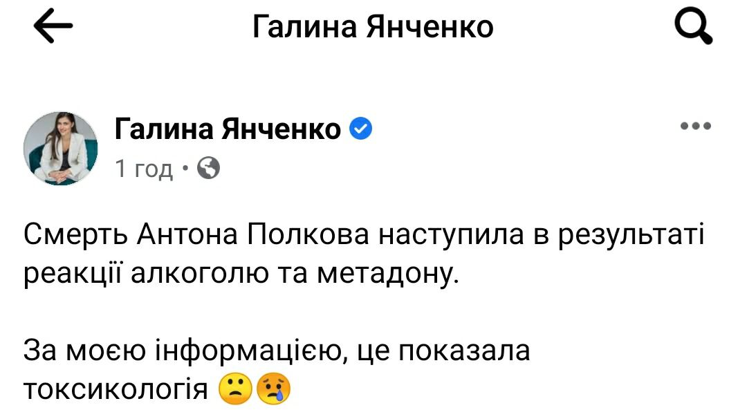 ⚡ "Слуга народу" Янченко заявила, що в крові померлого нардепа Полякова виявили алкоголь і метадон