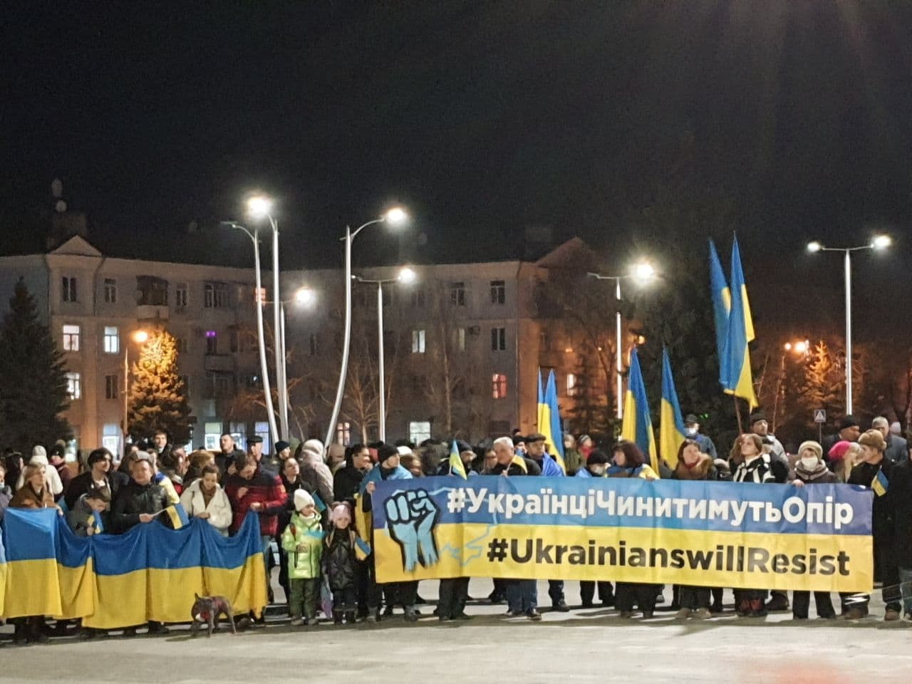 У Краматорську 23 лютого на площі Миру о 17:30 розпочалась акція "Краматорськ — це Україна". Люди вийшли з державними прапорами. А Бахмуті подібна акція розпочалась біля ДК "Мартинова Є."