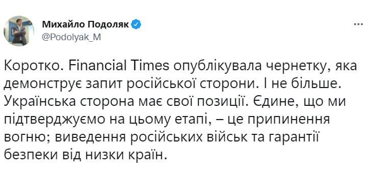 "Єдине, що ми підтверджуємо на цьому етапі, – це припинення вогню; виведення російських військ та гарантії безпеки від низки країн", - зауважив він.