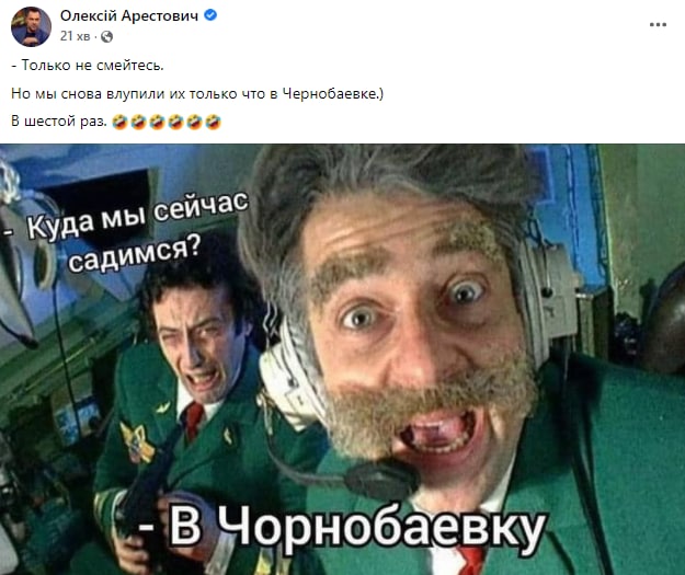 "Аеродром у Чорнобаївці Херсонської області, який росіяни використовують під свої командні пункти, місця збору літаків: знову порадували нас результатом Збройні сили України, бо знову нанесли удар по аеропорту Чорнобаївки", – сказав Арестович