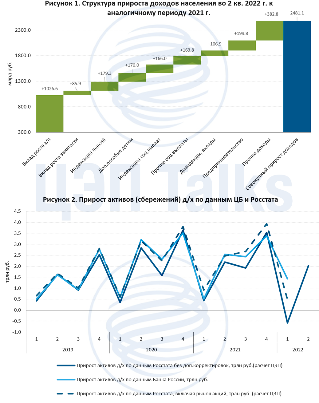Столь высокий прирост доходов в номинальном выражении к уровню прошлого года объясняется ростом фонда оплаты труда и социальных выплат (Рисунок 1) и согласуется с данными оперативной статистики. Так, номинальный прирост трудовых доходов составил +11,3% г/г, в то же время рост средней заработной платы за квартал―~+9% г/г (рост по широкому кругу отраслей), численность занятых увеличилась на 0,5 млн чел. Высокий рост социальных платежей в равной степени объясняется началом дополнительных выплат семьям с детьми от 8 до 17 лет (+170 млрд руб.) и более высокой индексацией пенсий (+180 млрд руб.) и пособий (+166 млрд руб.) (средняя пенсия в июне 2022 г. была на 16,4% выше, чем год назад). В структуре доходов населения вопросы вызывает только прирост процентов по вкладам и дивиденды ― на наш взгляд «перекладывание» депозитов населения на вклады с высокой процентной ставкой могло бы привести к еще большему приросту по этой строке.