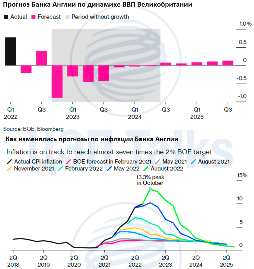 Наблюдаемое замедление роста британской экономики вызвано скачком цен на энергоносители и другие товары. В результате инфляция в Великобритании достигла уровня 9,4% с вероятным пиком в октябре в районе 14%. В октябре ожидается очередной раунд повышения цен на топливо, газ и электроэнергию для британских домохозяйств.