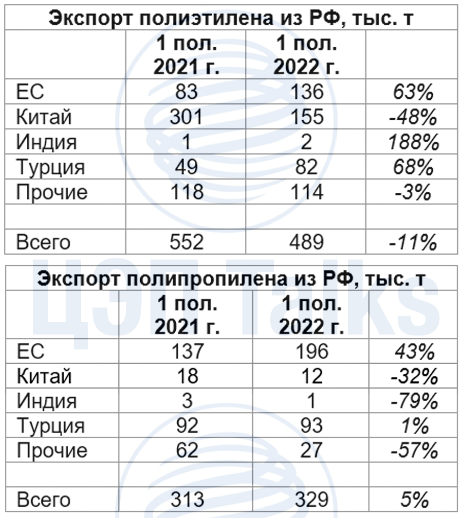 Турецкие потребители также значительно увеличили спрос на российские полиэтилен и полипропилен в 1 полугодии 2022 г., внешний спрос со стороны китайских компаний, напротив, упал почти в 2 раза.