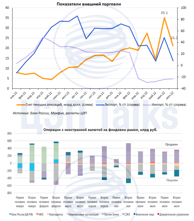 Видимое увеличение финансовых операций с внешним сектором в июле 2022 г. ослабило влияние высокого профицита внешней торговли на укрепление курса рубля.