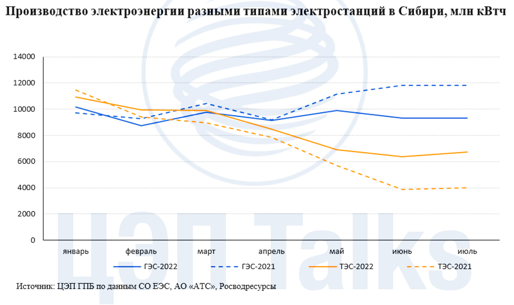 На этом фоне производство электроэнергии гидроэлектростанциями в Сибири в июне и июле было на 21% ниже показателей прошлого года, а с начала года выработка снизилась на 10%. Перераспределение нагрузки пришлось в основном на угольные ТЭС Сибири, которые в последние 2 мес. нарастили производство на 67% г/г.