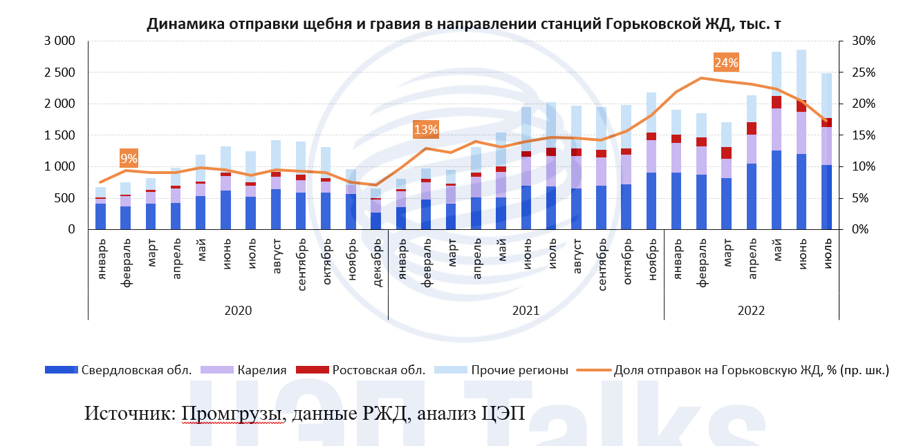 В 2021-2022 гг. отправка щебня в направлении станций Горьковской ЖД ощутимо выросла по сравнению с периодом до начала строительства. Так, в 2021 г. было отправлено больше на 46% г/г, а в 2022 г. – еще на 64% больше, чем в соответствующий период 2021 г. Поставки щебня на Горьковскую ЖД в 2020 г. составляли до 10% от суммарных внутренних перевозок щебня по сети РЖД. А в 2022 г. - от 17% до четверти от общих объемов перевозок. Наибольшую долю в поставках имеют карьеры из Свердловской обл. (например, из города Асбеста) и Карелии. При это поставки идут и из Челябинской обл., Ростовской обл. и других направлений.