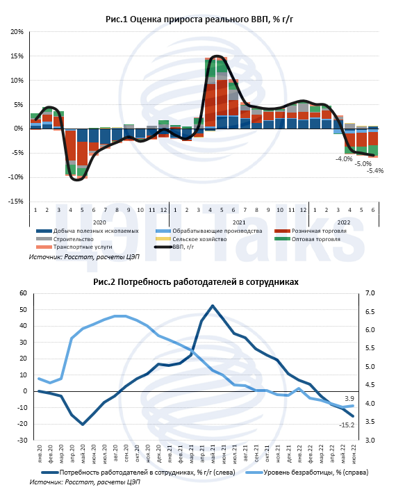 Несмотря на видимое снижение экономической активности, уровень безработицы во 2 кв. 2022 г. сохранялся на низком уровне (3,9%), адаптация рынка труда к изменившимся экономическим условиям происходит в основном за счет сокращения реальных заработных плат (-6,1% г/г в мае) при сохранении официальной занятости. Однако спрос работодателей на трудовые ресурсы во 2 кв. 2022 г. снижался (рис.2) (наиболее существенно в отраслях интеллектуальных услуг, финансовом секторе), что отражает будущую тенденцию к сокращению занятости во 2 пг. 2022 г. (в 2020 г. сокращение найма было опережающим для уровня безработицы).