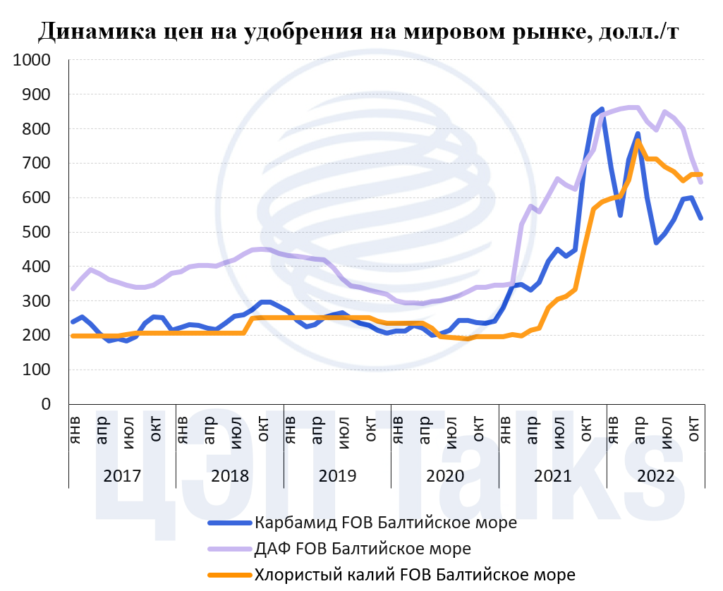 В октябре 2022 г. стоимость карбамида в портах Балтийского моря достигала в среднем 600 долл./т, цена на диаммонийфосфат превышала 710 долл./т, стоимость стандартного хлористого калия составляла в среднем 670 долл./т.