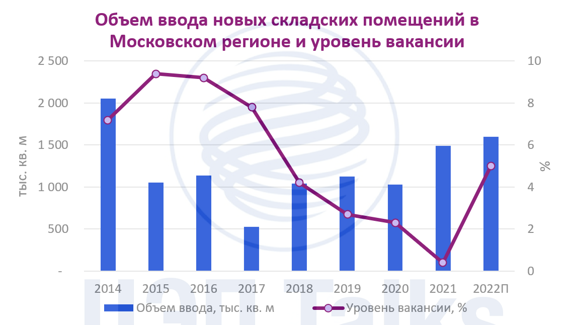 На 2022 г. был запланирован ввод около 2 млн кв. м новых складских объектов, однако данные объемы были скорректированы в сторону уменьшения из-за внешнеторговых ограничений, нарушений логистических цепочек поставок, сокращения степени присутствия или полный выход некоторых крупных международных арендаторов. Тем не менее после удачного для сегмента 2021 г. были заключены сделки о строительстве складских комплексов «под ключ» («built-to-suit»), в основном за счет реализации этих соглашений объем ввода за январь-сентябрь 2022 г. составил 994 тыс. кв. м – наибольший показатель за аналогичный период с 2014 г.