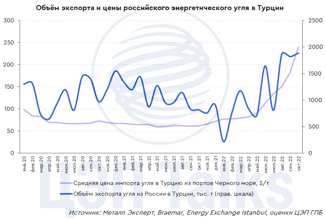По предварительным данным в октябре 2022 г. большая часть импорта угля Турцией пришлась на уголь из России – около 65-70%. Поставки в сентябре 2022 г. выросли более чем в 2 раза по сравнению с сентябрем прошлого года, причем экспорт российского энергетического угля оказался максимальным за последние 15 лет и составил 1,8 млн т. По итогам сентября Турция заняла 3-е место по закупкам угля из России после Южной Кореи и Китая.