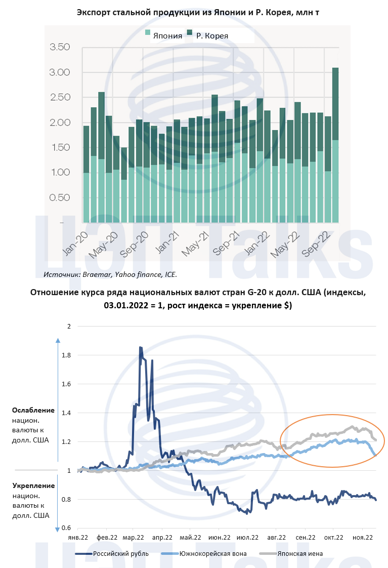 Несмотря на позитивные данные по росту экспорта из Японии и Р.Корея, снижение внутреннего спроса пока не удается преодолеть. По данным WorldSteel за 9 мес. 2022 г. производство стали в Японии сократилось на 6%, а в Р.Корея на 4,4%. Девальвация национальных валют ведет к росту себестоимости импортного сырья для сталелитейщиков, но этот рост цен постепенно перекладывается на потребителя. Инфляция и логистические ограничения также негативно влияют на спрос со стороны металлоемких отраслей – строительств, автопром, машиностроение.