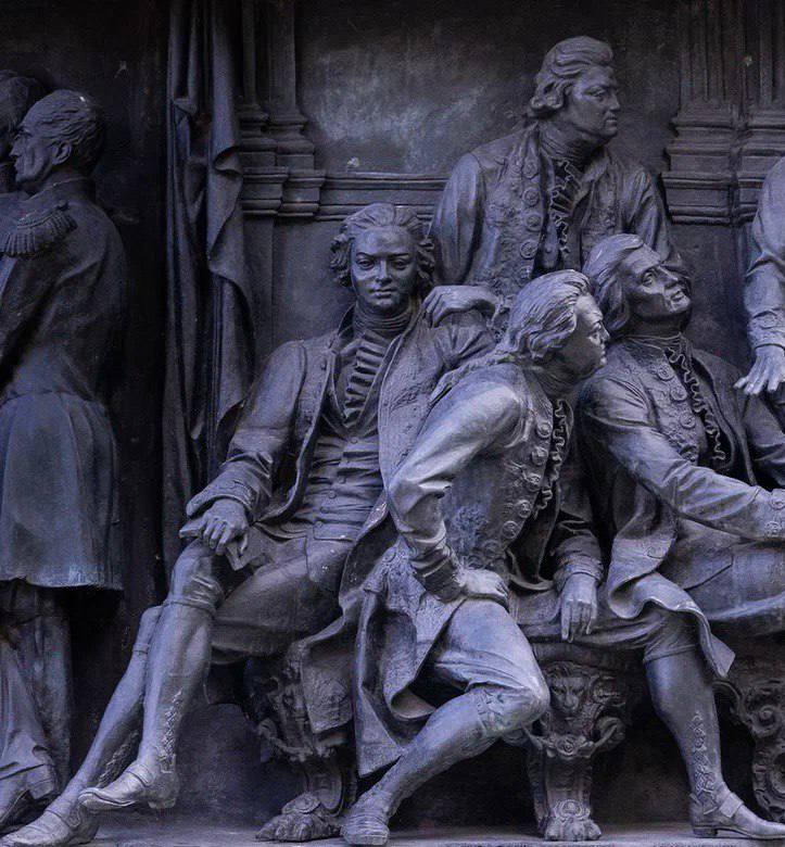 Горельеф «Писатели и художники» на памятнике «Тысячелетие России» открывает великий ученый Михаил Васильевич Ломоносов. Труды его имеют мировое значение и во многом опередили свое время. Вряд ли найдется хоть одно направление в науке, в котором бы не преуспел Ломоносов: его авторству принадлежит множество открытий в области химии, физики, астрономии, металлургии, механики, географии и геологии.