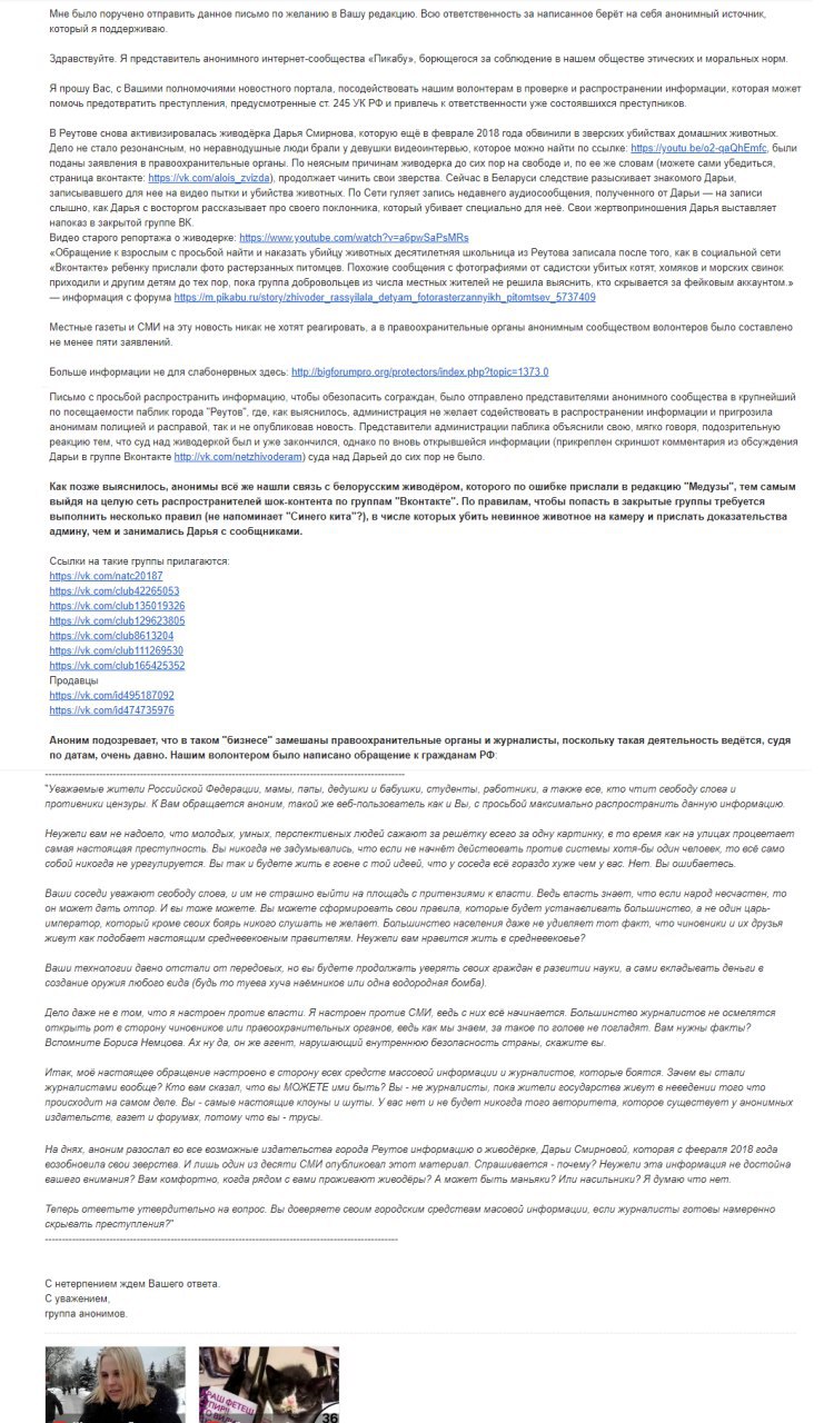 Мы календа...нет, вы серьезно думали, что мы тоже решим хайпануть на теме с вечным Шуфутинским, который льется из каждого паблика сегодня? Нет, спасибо, нам не до шуток, у нас серьезная тема сегодня на разборе. Вот, к примеру, сообщество "Лентач" на голубом глазу ссылается на материал про некие сообщества живодеров, которые работают по принципу "Синих китов", занимаются сатанизмом и вообще убийство животного на камеру в этих сообществах - это способ "принять в секту". Что интересно, главный спикер у издания - Анастасия Федюнина, представитель "Зооправа"