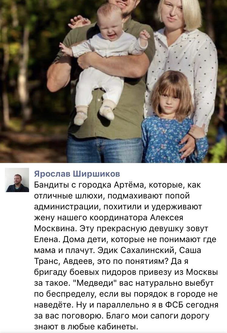 Доброго денечка, и снова с выборной повесткой всех вас. Вы-то уж думали, что выборы прошли, и поток дезы и глупейших слухов иссяк? Ан нет, отдельные персонажи умудряются засрать информационное пространство даже в день выборов в регионах. Вот, к примеру, сегодня Ярослав Ширшиков из КПРФ опубликовал информацию о том, что в день выборов губернатора Приморья некие люди из власти похитили жену Алексея Москвина, координатора штаба Андрея Ищенко.